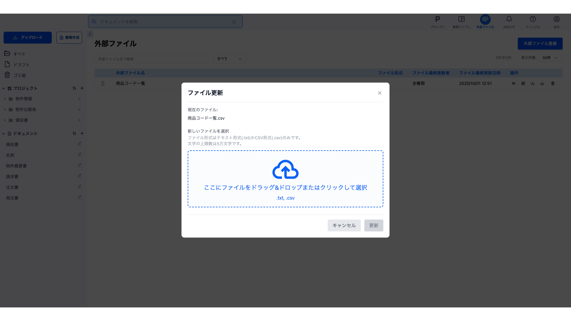 更新したいファイルをアップロードし、「更新」ボタンをクリックすると外部ファイルが更新されます。
