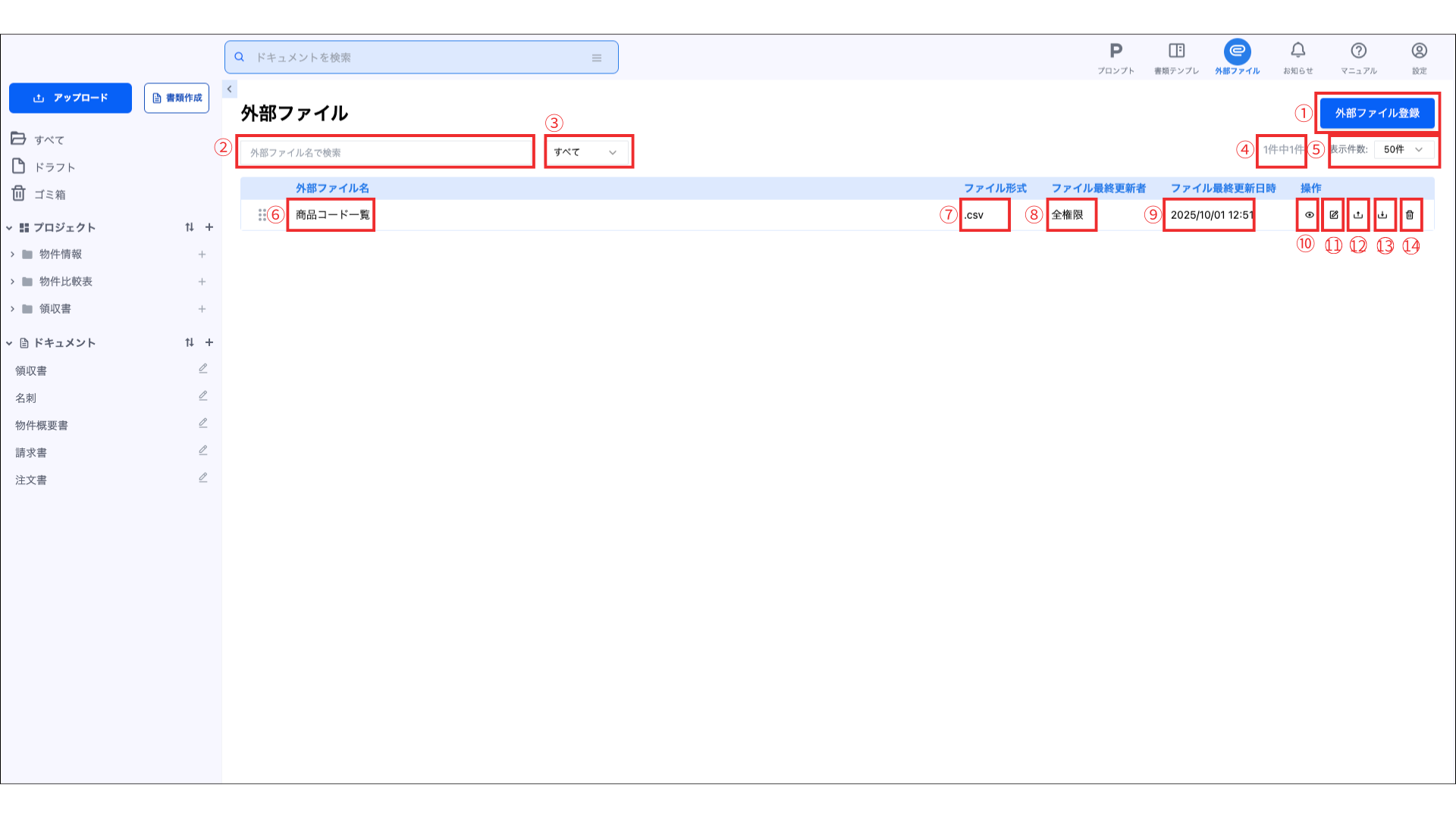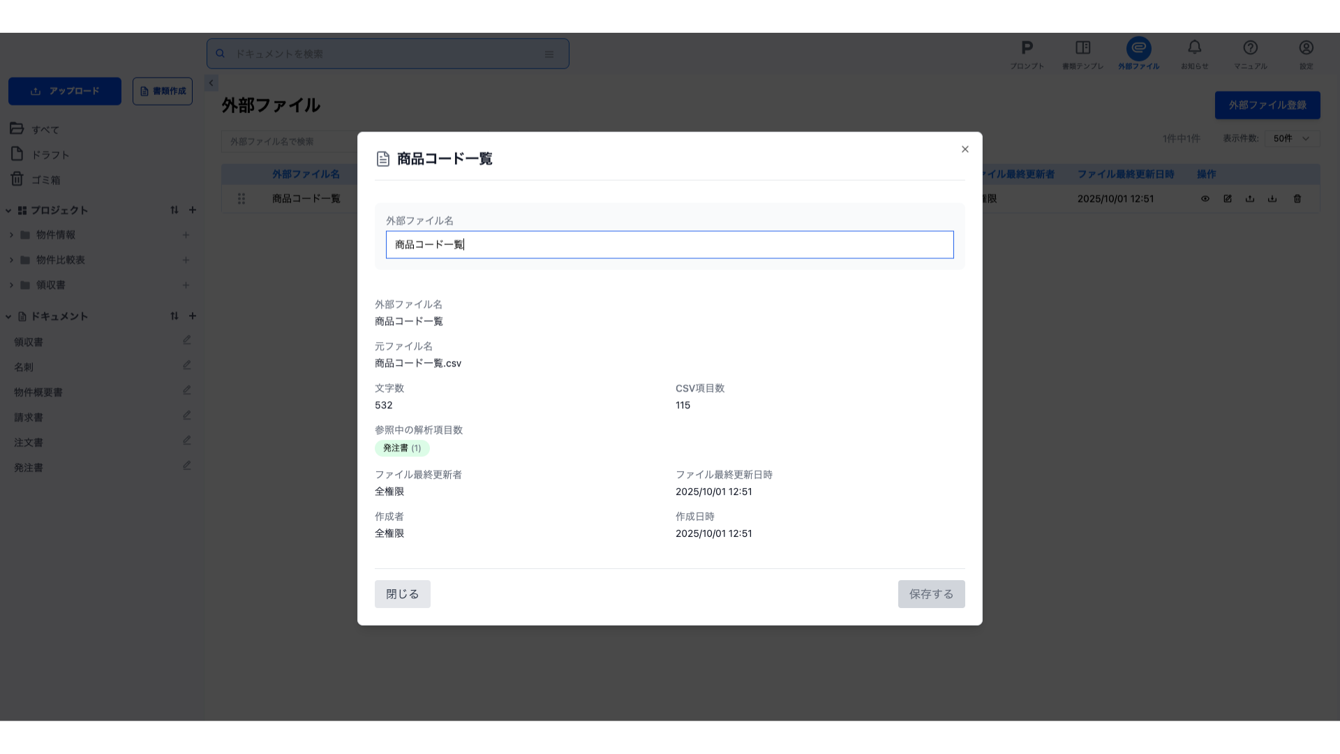登録されている外部ファイル名の編集と、ファイル情報が閲覧できます。