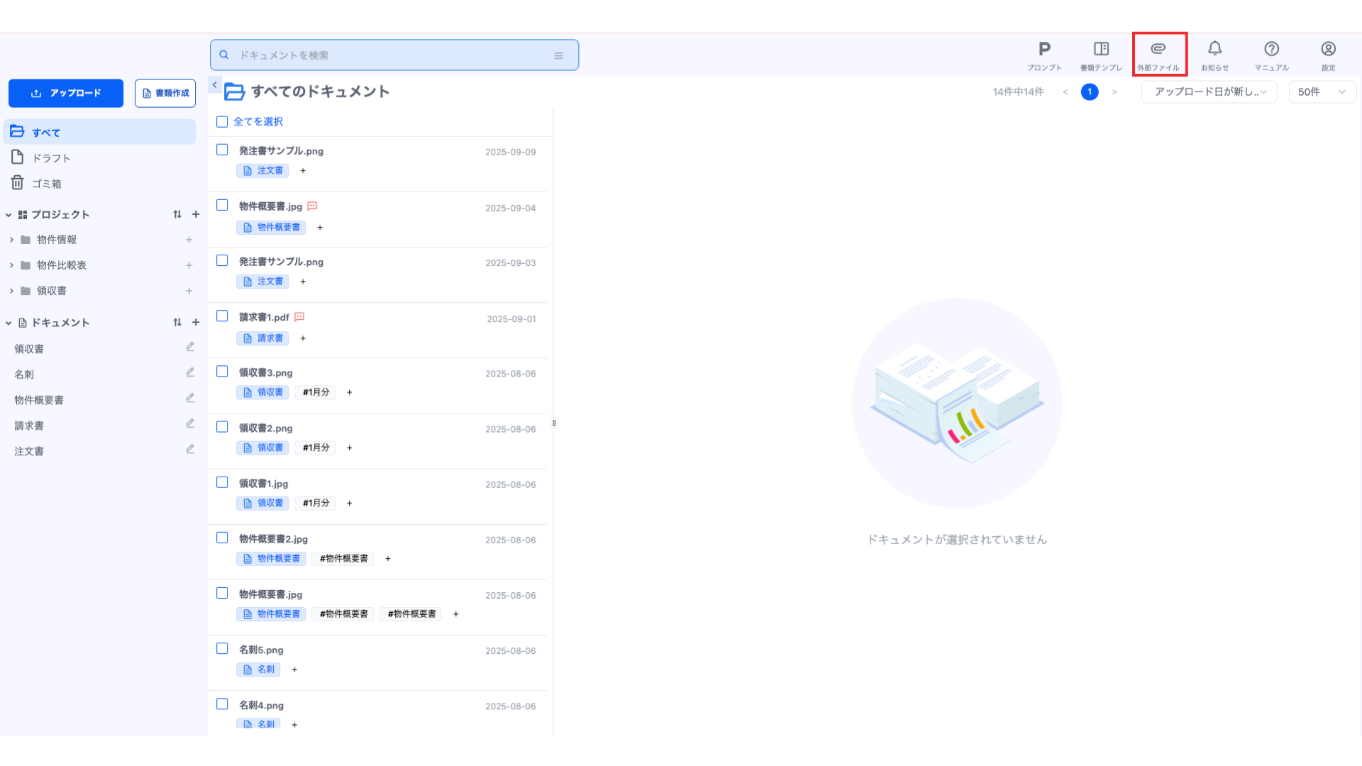 外部ファイルは画面右上のヘッダーの「外部ファイル」アイコンから登録できます。